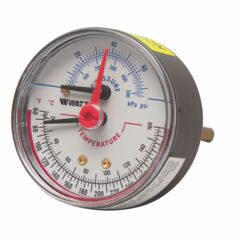 Series LFDPTG-3 Combination Pressure and Temperature Gauges are used in commercial, residential, and institutional HVAC applications. It is a center, back-entry type model with a black enamel steel case, Kostil Polymer window, 1/2 in. NPT connection, copper alloy Bourdon tube pressure element, and bimetal spiral spring. Accuracy is ASME, Type B. Available in various pressure rating scales.
